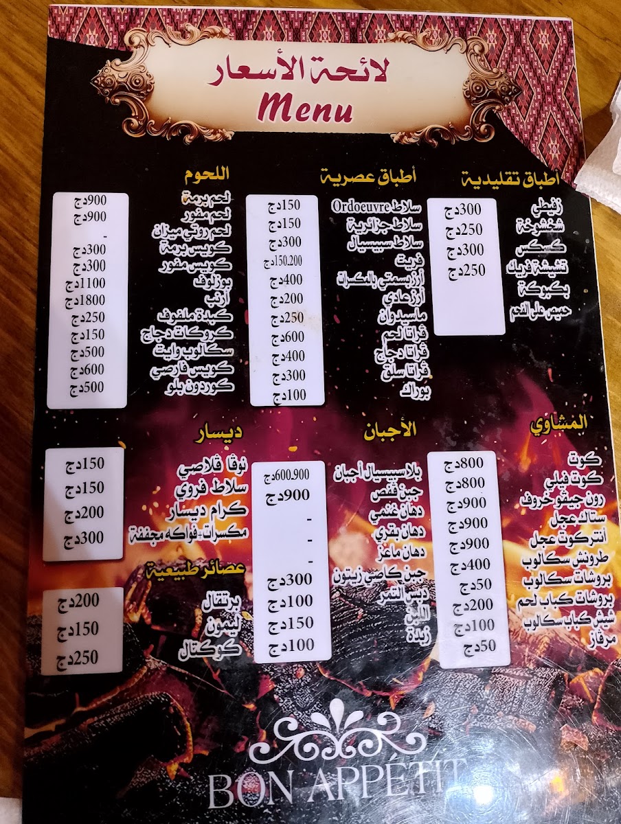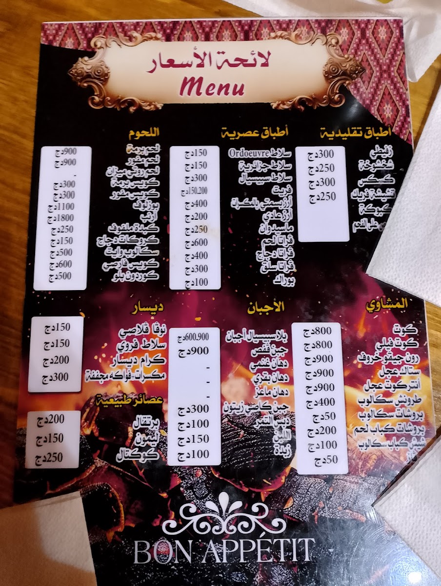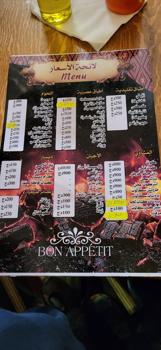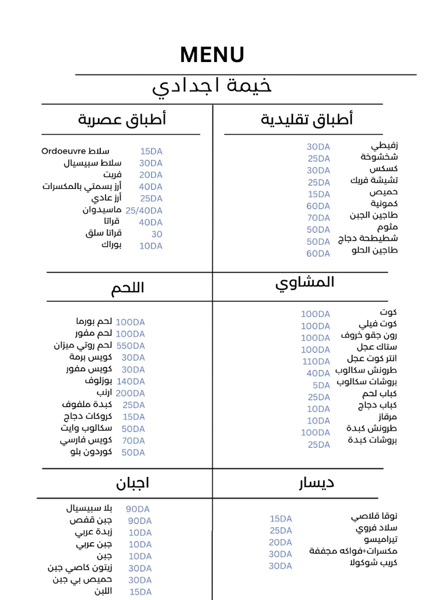 The menu at Restaurant Ajdadi reflects a deep connection to local flavors and generous sharing traditions, offering a well-curated selection that feels both authentic and satisfying. Freshness and balance stand out immediately through options like salades and Entrées Froides, which prepare the palate with light, clean flavors before moving into heartier dishes. Traditional staples such as Chakhchoukha, شخشوخة مسيلية, Chalchouka de Bousaada, Z'Fitti, and Zviti Et Chekhchoukha showcase regional identity through bold spices, rich textures, and comforting warmth, while specialties like مشاوي and Viandes Grillée add a smoky, savory depth that appeals to lovers of grilled meats. Cheese plays a central role in the menu, highlighted by selections including طبق فرماج محلي, Plateau de Fromage Et Dattes Farcis, Assiette de Fromages, Plat de Fromages Variés, Variété de Fromages, Assortiment de Fromage, and the distinctive Gasfs Le Fromage de Bousaada, each emphasizing local dairy craftsmanship and variety. More elaborate combinations such as زفيطي روز بالمكسرات كروكات سكالوب مجموعة اجبان طبيعي demonstrate creativity while still respecting traditional roots. To balance the richness, simple and refreshing choices like زبادي مشكلة and بطيخ offer a cooling contrast that rounds out the dining experience. Overall, the menu feels cohesive and thoughtfully assembled, with each dish contributing to a broader picture of regional Algerian cuisine presented in a generous, welcoming style.